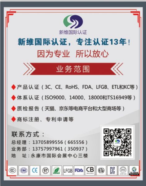 新維國際認證位于浙江永康市會展中心六樓,經歷十五年風風雨雨,匯集成本地產品認證、體系認證和企業管理咨詢培訓較大和較有實力的公司之一,業務范圍已經擴展到全省,甚至到全國;公司擁有非常專業的認證專員、有實戰經驗和專業的管理培訓教練,公司擁有自己的檢測設備,方便產品預檢測。我們與德國TUV、瑞士SGS、英國ITS、法國BV、美國UL、中國質量認證中心、中國中檢集團、中國家用電器研究院、國家玩具檢測中心、浙江立德、浙江方圓、北京中聯天潤和北京凱新等機構建立了親密的合作伙伴關系。